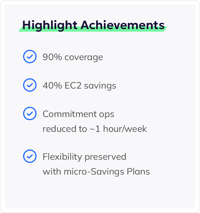As the platform continued to grow year over year, cloud costs rose rapidly, making inefficiencies inevitable. With each team managing its own workloads, Reserved Instances and Savings Plans were often over-provisioned to avoid outages, resulting in unnecessary spend.